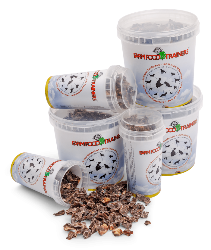 Farm Food Trainers sono bocconcini di cuore essiccato ([bovino]) / ([cervo]) croccanti e gustosi che puoi portare comodamente nella tasca della giacca o dei pantaloni senza il rischio che si sbriciolino o diventino appiccicosi. E per premiare i nostri amici durante l’addestramento o semplicemente nelle lunghe passeggiate abbiamo creato il marsupio Farm Food per contenere un piccolo barattolo Trainers!